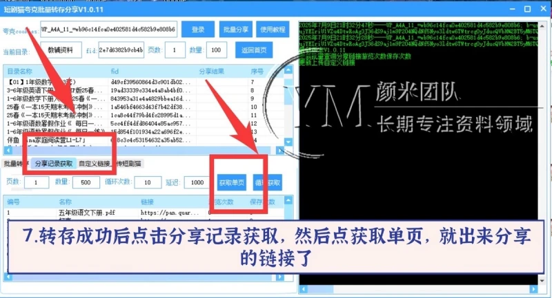 步骤7 :转存成功后点击分享记录获取,然后点获取单页,就出来分享的链接了